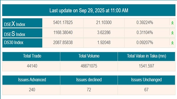 বিদায়ী সপ্তাহে (১৮-২২ ফেব্রুয়ারি) প্রধান শেয়ারবাজার ঢাকা স্টক এক্সচেঞ্জে (ডিএসই) চার কর্মদিবস লেনদেন হয়েছে। এই চার কর্মদিবসে লেনদেনে অংশ নিয়েছে ৪০৯টি প্রতিষ্ঠান। এরমধ্যে ১২১টির দর বেড়েছে, ২৪৭টির দর কমেছে, ৩০টির দর অপরিবর্তিত ছিল এবং ১১টির লেনদেন হয়নি।